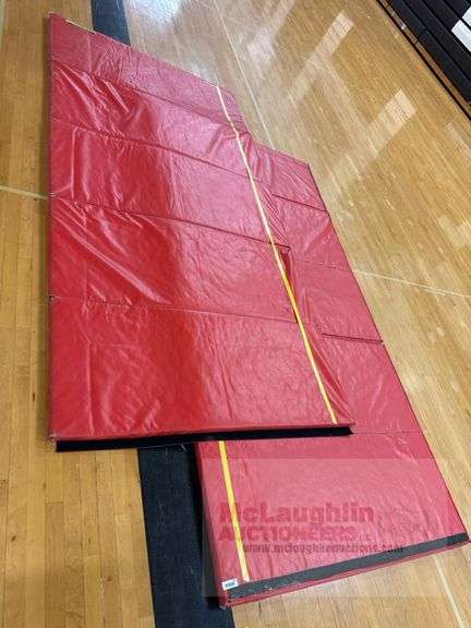 Description: Gymnastics Mat, Red, Foldable, Vinyl Cover, 8 ft x 4 ft, Polyethylene foam, Caution label.