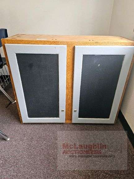 Wooden cabinet with double hinged doors, 2 shelves, oak and grey/black finish, dimensions approx. 30 in x 36 in x 12 in