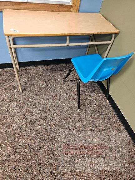 School Desk and Chair Set, Blue Chair, Beige Desk, Metal frame with wooden top, Plastic seat with metal legs, Stackable chair, Open front desk.