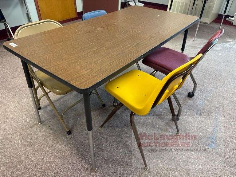 This table and chair set includes a brown laminate table with metal legs and four chairs in mixed colors: Yellow, Red, Blue, and Beige, seats up to 6 people, Table Dimensions: Approx. 60 in L x 30 in W x 29 in H