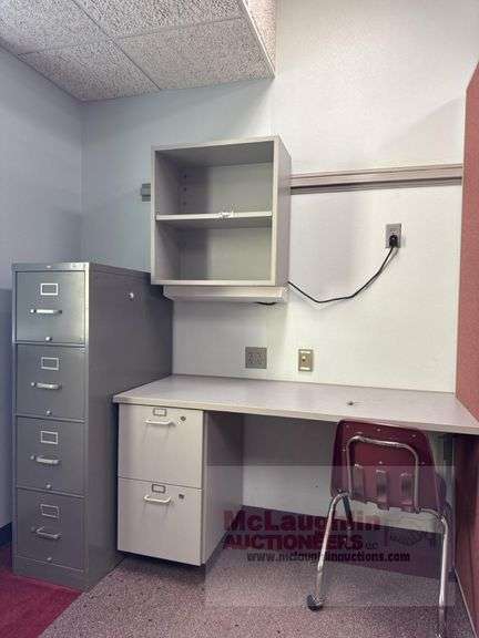 Office furniture set with desk, filing & wall cabinet, features desk with 2 drawers, 5-drawer filing cabinet, wall cabinet, metal and wood construction, gray and white color, keys included.