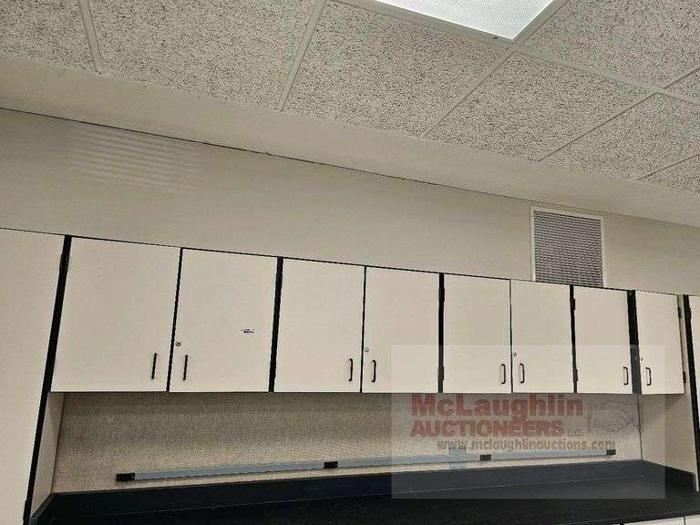 Beige Wall-Mounted Storage Cabinets, featuring two adjustable shelves per cabinet, constructed likely from wood or wood composite, non-lockable.