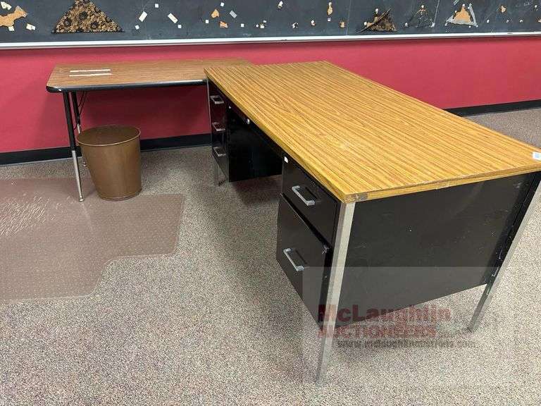 Metal Frame Desk with Wood Top, 5 Drawers, Black, Dimensions: Approximately 60 x 30 x 29 inches. Includes Side Table and Trash Can