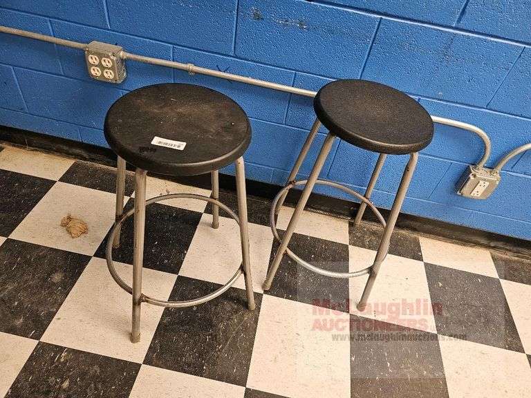 Pair of metal frame stools, featuring a black seat and silver frame, height approximately 29 inches