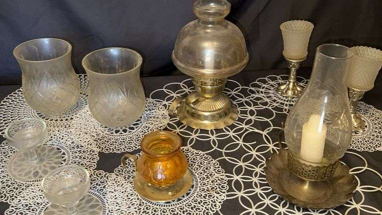 Vintage oil lamps and candle holders, glass and metal, antique/vintage style, includes frosted glass shades, metal bases, and various glass designs, typically range from 8-12 inches (20-30 cm) in height, estimated 2-4 lbs (0.9-1.8 kg) per lamp.