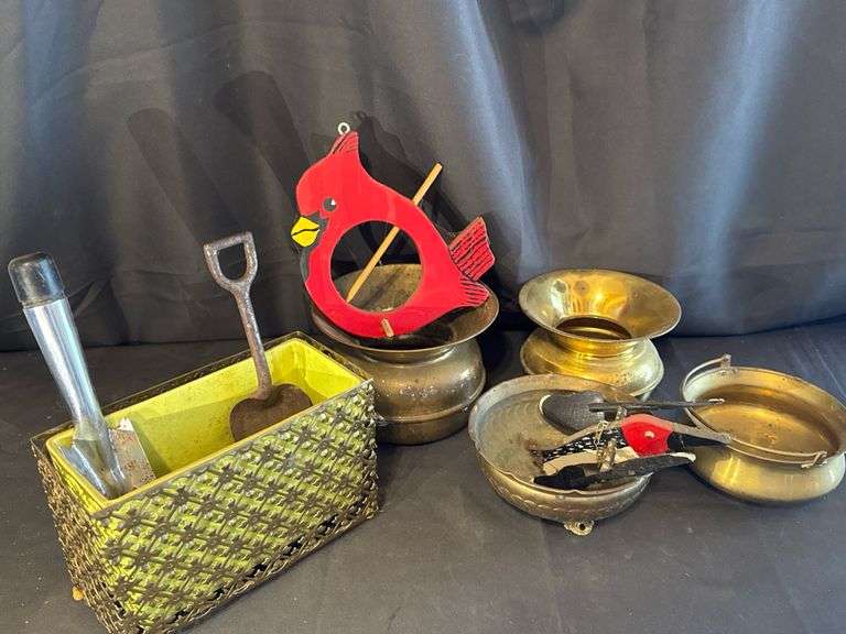 Assorted Vintage Brassware Collection, includes brass containers (4 pieces), red wooden bird decoration (1 piece), metal garden tools (2 pieces), metal basket (1 piece), approximate dimensions for brass containers are 5 inches in diameter each, red wooden bird is approximately 8 inches tall, metal basket is approximately 10 inches in length.