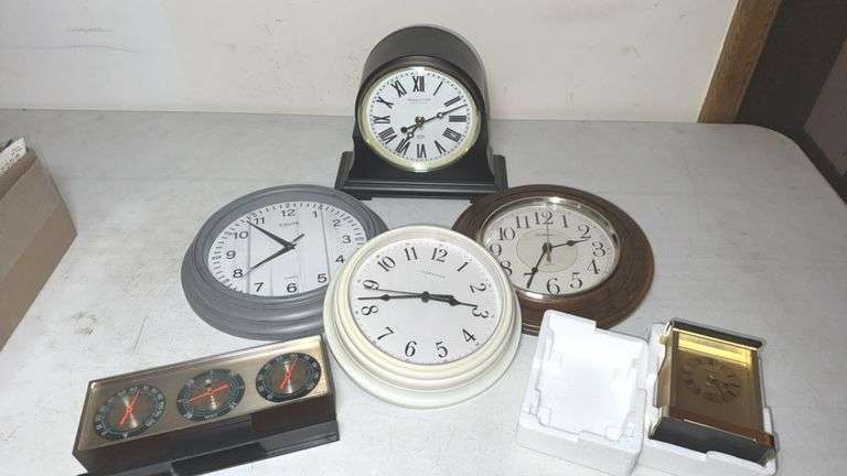 Featuring a selection of wall and mantel clocks by Ingraham and Seth Thomas alongside a Taylor weather station with temperature, humidity, and barometer features, analog display.