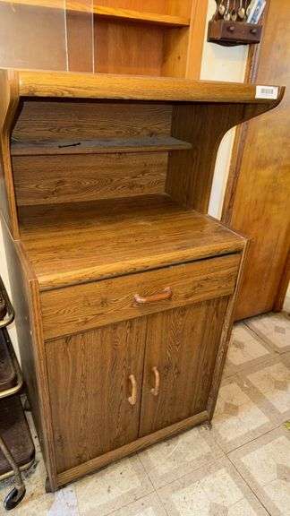 Kitchen Hutch Cabinet, features a wood grain finish, 1 drawer, 2 doors, top shelf, lower cabinet with doors.