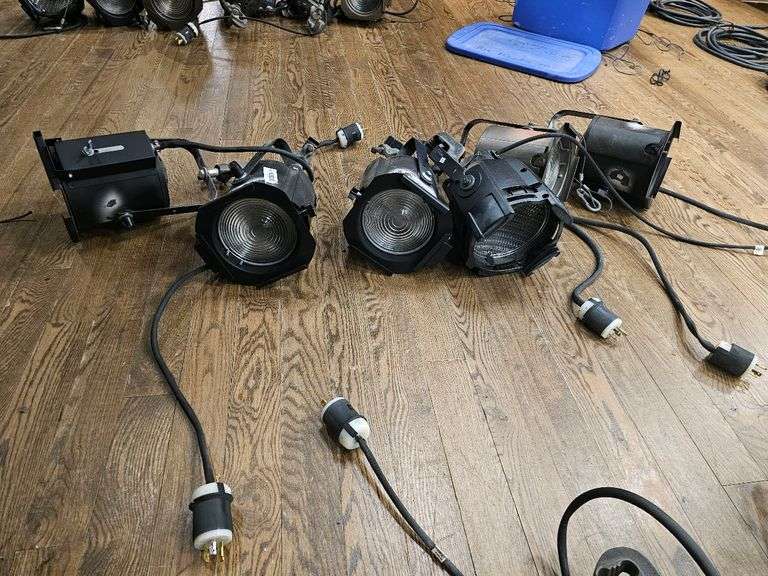 Altman 65Q Stage Lighting Fixtures, 750W, Tungsten Halogen, 120V, 9-54 degrees beam angle, 3200K color temperature, manual control, C-clamp mounting, includes power cables.