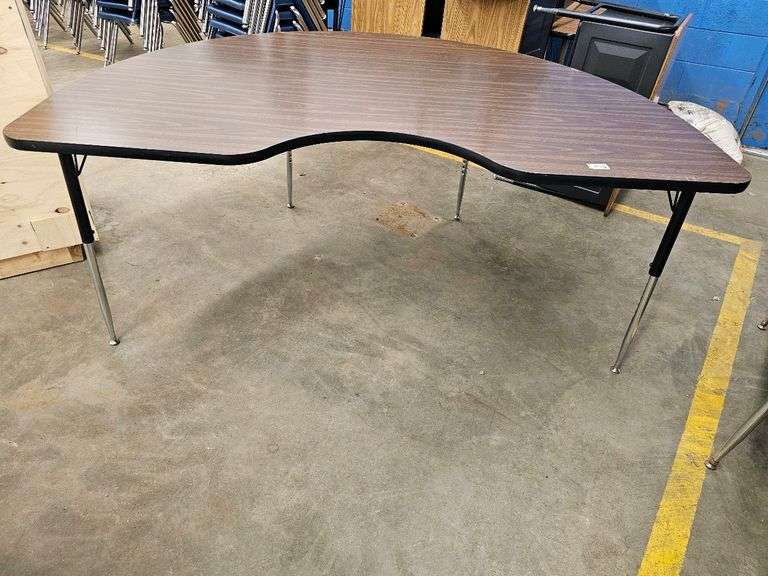 Kidney Shaped Table, Adjustable Height, Laminate Wood, Dark Wood, Features: Kidney Shaped, Adjustable Legs, Dimensions: Approximately 8' x 48 x 24-36 inches (183 x 122 x 61-91 cm), Weight: Approximately 50 lbs (22.7 kg).