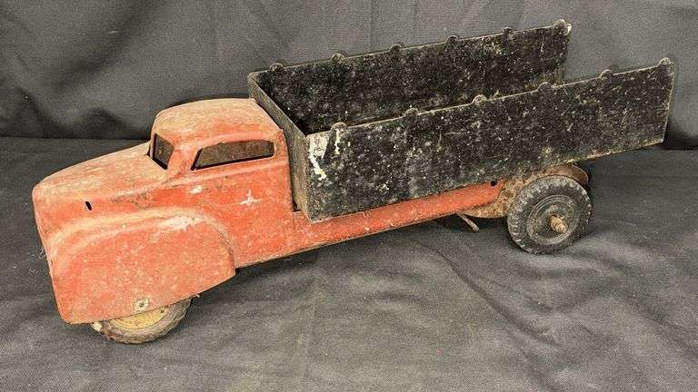 Vintage Metal Toy Dump Truck, red with black bed, open bed, missing one of the wheels, metal with rubber wheels, visible rust and wear.