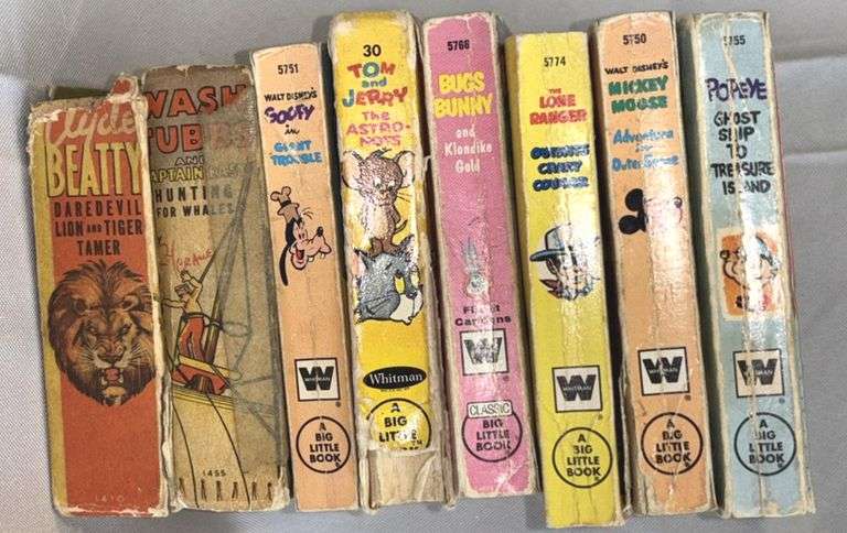 Vintage Big Little Books Collection, featuring titles like "Wash Tubbs and Captain Easy", "Clyde Beatty", "The Lone Ranger", "Bugs Bunny and Klondike Gold", and more. Published by Whitman Publishing Company, typically 200+ pages, dimensions approx. 3.625 x 4.5 inches (9.2 x 11.4 cm), weight approx. 0.25 lbs (113 grams) per book, flip-it cartoon pages.