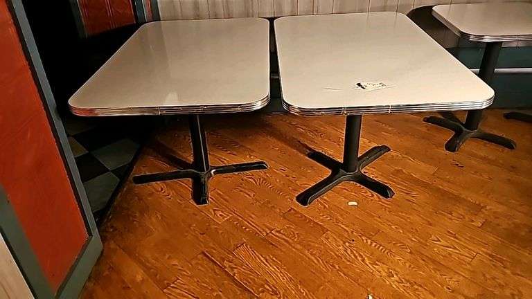Rectangular restaurant tables, dimensions 30x48x29 inches (76.2x121.9x73.7 cm), laminate top with metal base, white laminate top with black base, approximate weight 50 lbs (22.7 kg), intended for commercial use. Hardware for bases not included