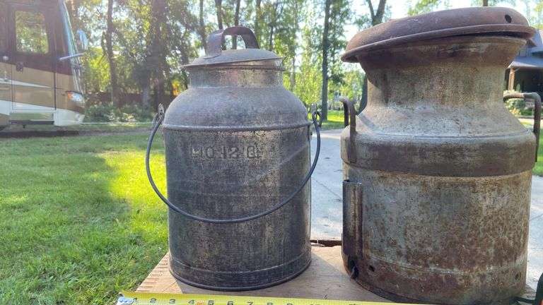 Vintage Milk Cans, Galvanized Steel, features include a lid with handle and carrying handle, rust present with visible wear.