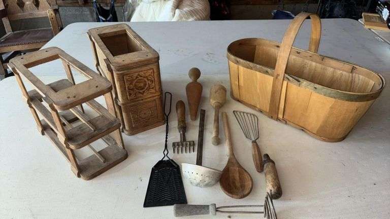 LOT 171 - Antique Wooden Sewing Machine Drawers, Utensils and Basket