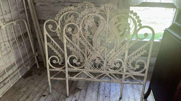 Intricate White Wicker Headboard, featuring a detailed scroll design, Material: Wicker, Twin Size. Special Features: Vintage appearance.