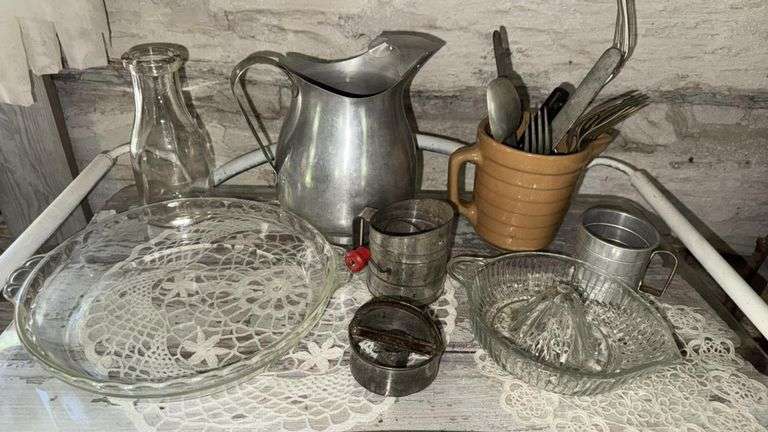 This collection features a variety of vintage kitchenware, including a glass pie dish, a metal pitcher approximately 8 inches tall, a glass bottle, a juicer, a flour sifter, and assorted cutlery, clear, silver, and brown in color, made from glass, metal, and ceramic materials.