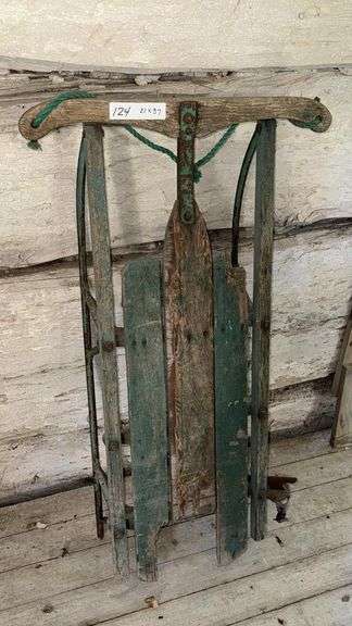 Vintage Wooden Sled, dimensions 21 x 37 inches (53.34 x 93.98 cm), wood and metal construction, green and blue color, traditional design, metal runners, wooden slats, rope handle, likely mid-20th century, Country of Manufacture: United States.