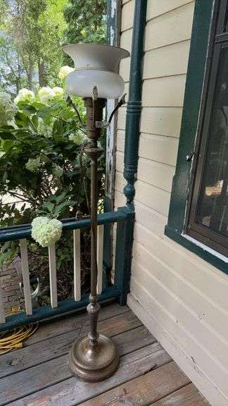 Traditional Floor Lamp, 59" Height, Metal & Glass, Bronze/White, Corded Electric, Rotary Switch, Estimated 1940s-1950s.