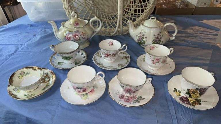Tea Set with Floral Patterns, Fine Bone China, Various Brands and Patterns, includes Elizabethan, Royale Garden, Royal Albert, Avon, Clare, gold trim, England, 1974 (for Avon Pink Roses).