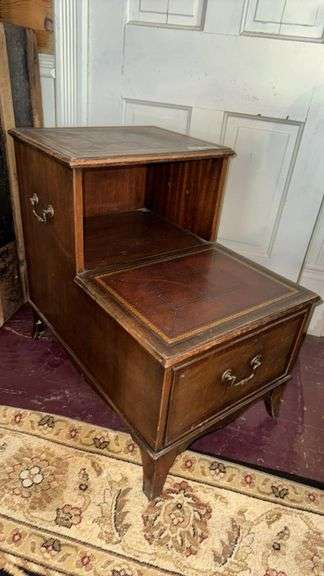 Vintage Wooden Step Table, Decorative Leather Top, 26"x18"x25", features two levels, a single drawer, brown finish with gold inlay, likely mid-20th century origin.