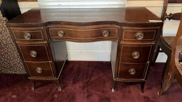 Traditional Wooden Vanity Desk, includes 7 drawers, dark wood finish, brass drawer handles, dimensions 47" x 18" x 30", features a fold-up mirror.