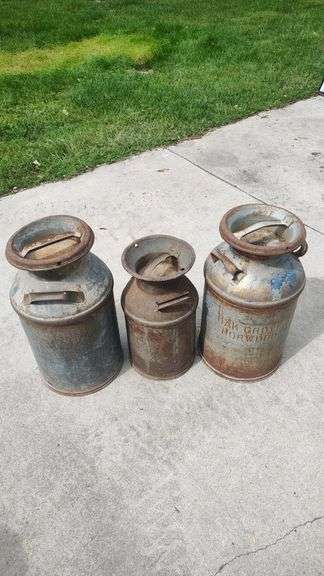 Vintage Milk Cans, Metal, one has OAK GROVE DAIRY NORWOOD MINN Markings, rusted with remnants of blue paint, handles on sides and lids