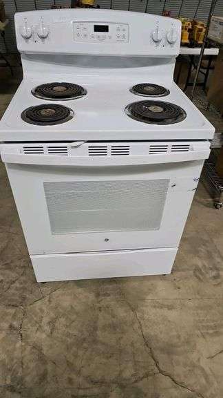 This GE Electric Range features 4 burners and a freestanding installation, control knobs, digital display, metal with enamel finish, 240 volts, 40 amps, drip pans, oven capacity approximately 5.0 cu. ft., serial number 229C6464P001. Used less than 3 years