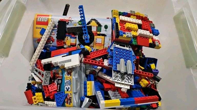 Lego Model 5508 Basic Bricks Deluxe Set includes various Lego blocks, partial view of Lego booklet, Red, Blue, Yellow, White, Black, Grey, Release Year: 2010, Weight: Approximately 1.5 lbs. (0.68 kg).