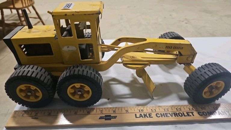 This vintage Tonka Toy Road Grader features a bright yellow color and measures approximately 17 inches (43.18 cm) in length. It is crafted from metal and plastic, includes six wheels, and features articulated steering. Estimated to be from the 1970s-1980s.