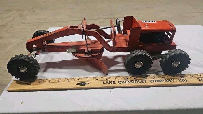 Vintage Toy Model Grader, featuring a striking red color, is a detailed replica with 6 wheels, a movable blade, and a 'Grader' decal on the side. Approximately 18 inches in length, made from metal and plastic. Possibly from the 1960s-1970s.