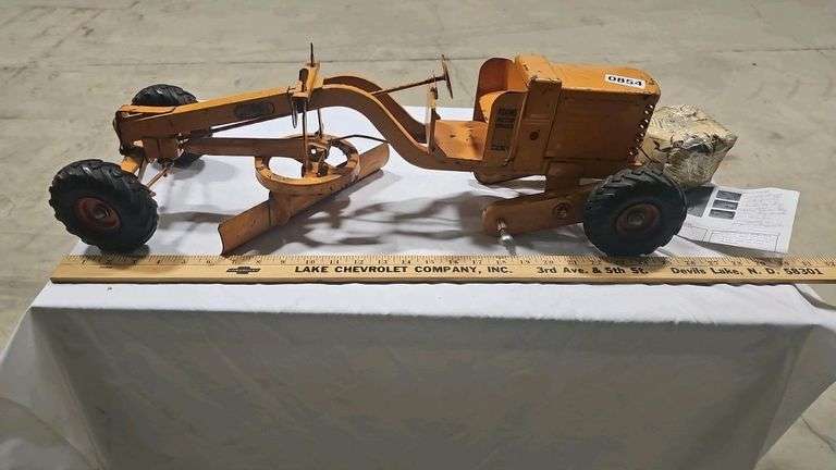 Adams Motor Grader Toy Model, Metal Construction, 1950s-60s, features rubber wheels, movable grader blade, detailed cab, includes a wrapped item to be missing tires