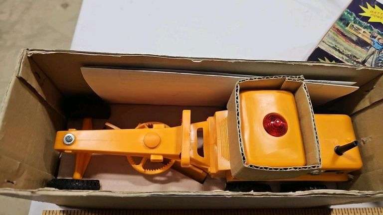 Vintage Road Grader Series 3, battery-operated, plastic construction toy, approximately 1:24 scale, original box, suggested age 3 years and up.