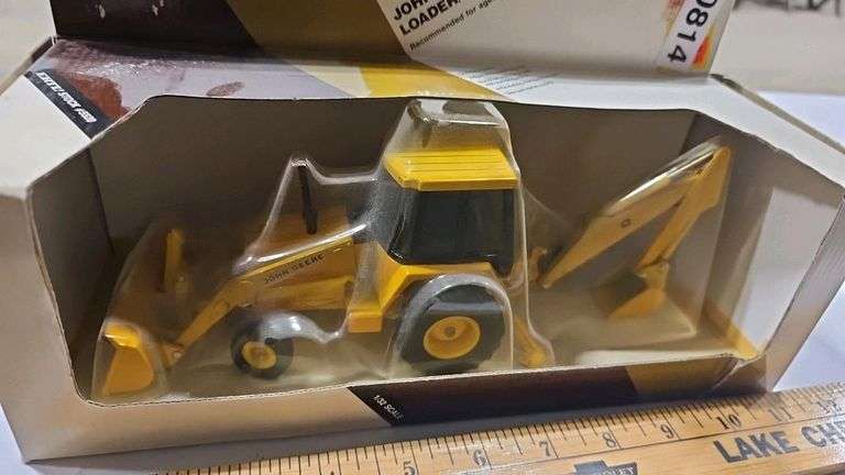 John Deere Loader Backhoe Die-cast Model Toy by Ertl, features include scale 1:16, material die-cast metal and plastic, recommended age 3 and over.