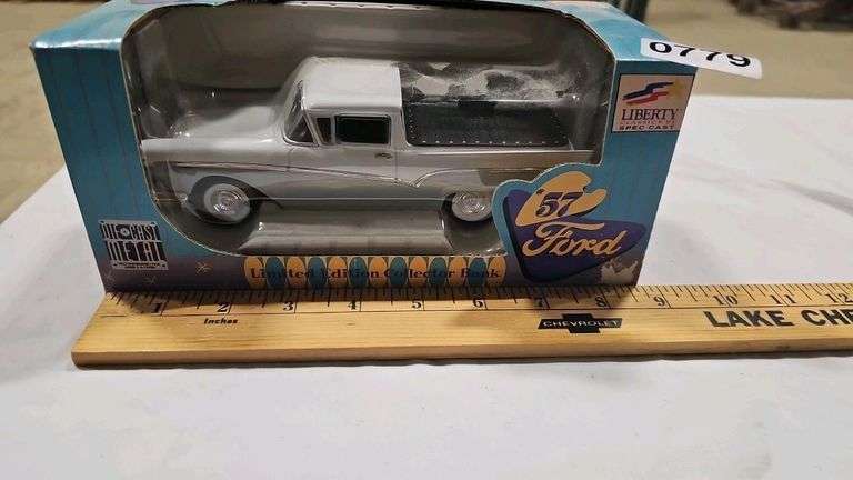 This 1957 Ford Diecast Model Car is a Limited-Edition Collector Bank, features a silver and white color scheme, original box by Liberty Classics, scale 1:25, with a connection to Liberty Classics.