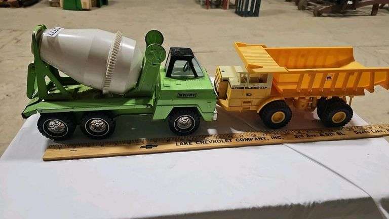 Vintage Nylint Toy Cement Mixer & Plastic Model Dump Truck Set, features metal and plastic construction, rotating drum on the cement mixer, tipping bed on the dump truck, likely from the 1970s-1980s based on design, green and white cement mixer, yellow dump truck.