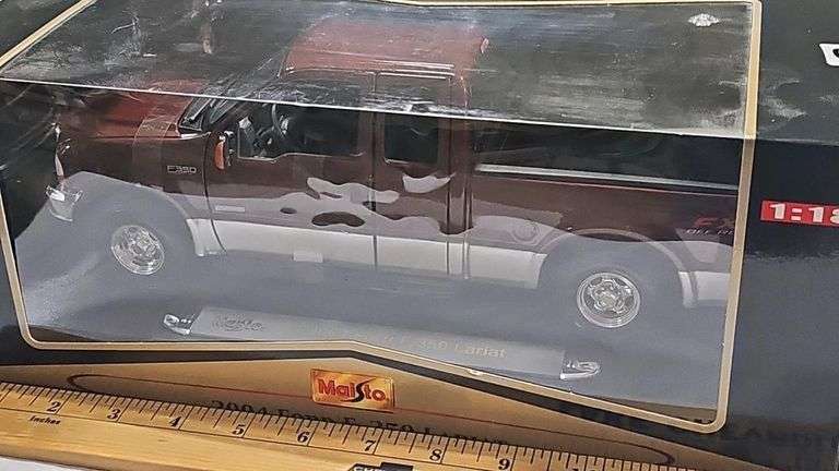 The 2004 Ford F-350 Lariat 1:18 Scale Die-cast Model by Maisto, features a maroon and silver finish, die-cast metal construction, Premiere Edition packaging.