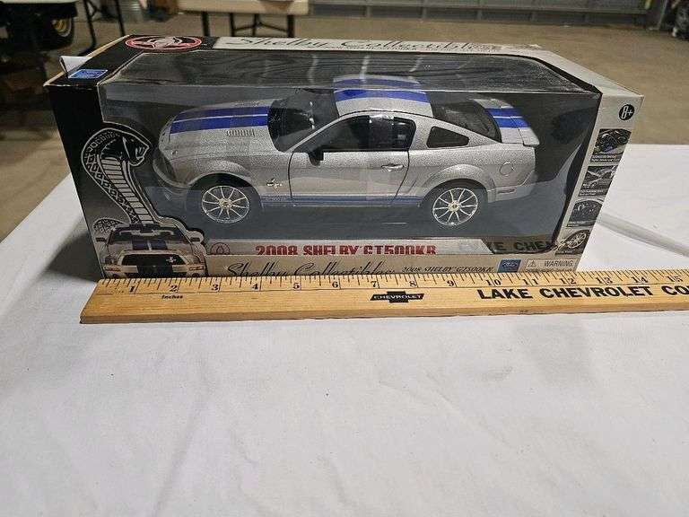 2008 Ford Shelby GT500KR 1:18 Diecast Model by Shelby Collectibles, diecast metal, silver with blue stripes, opening doors and hood, original box.