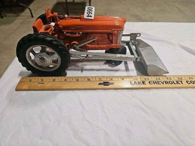 Hubley 1:16 Scale Tractor Model, features a front loader, detailed engine compartment, die-cast metal and plastic construction, made in USA, from the 1950s.