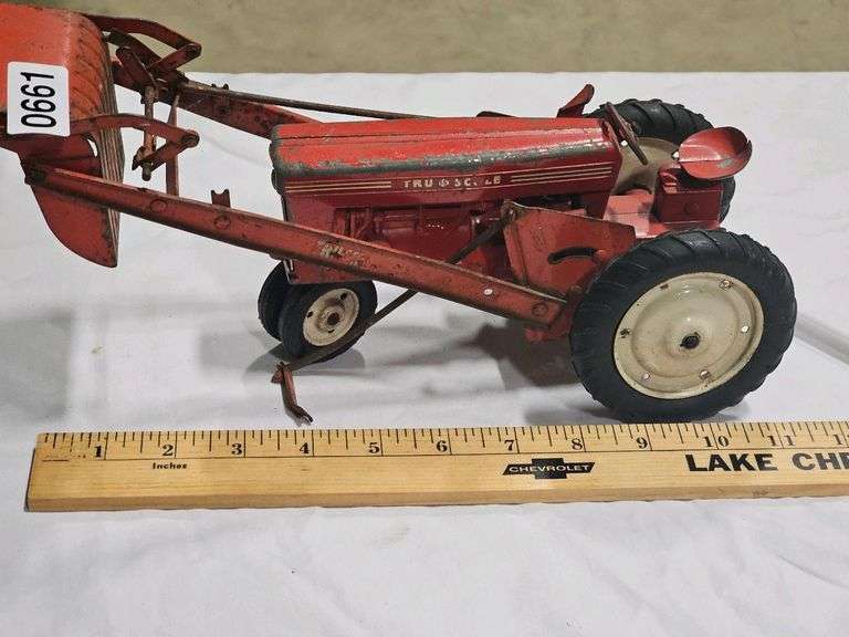 Tru-Scale Toy Tractor, Red, Metal, Front Loader, approx. 10 inches (25.4 cm) long, Manufacturer: Tru-Scale, Country of Origin: USA.