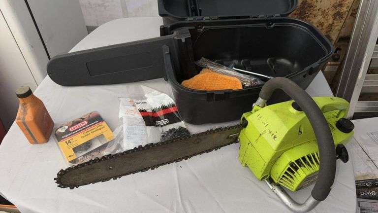 Poulan Micro Super XXV Deluxe Chainsaw, featuring a 14" bar and Oregon chain, gasoline-powered, engine displacement approx. 33 cc, weight approx. 10 lbs (4.5 kg), includes chainsaw case, chain installation tools, and cleaning cloth.