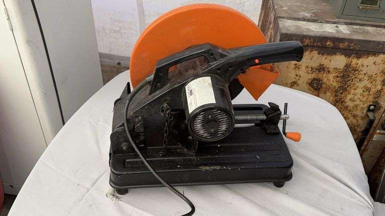Chicago Electric 91938 Cut-Off Saw, electric power source, 2.5 HP motor, 14-inch blade size, 5-inch cutting capacity, 120V, 15A, 3800 RPM, Serial Number: 47040x.