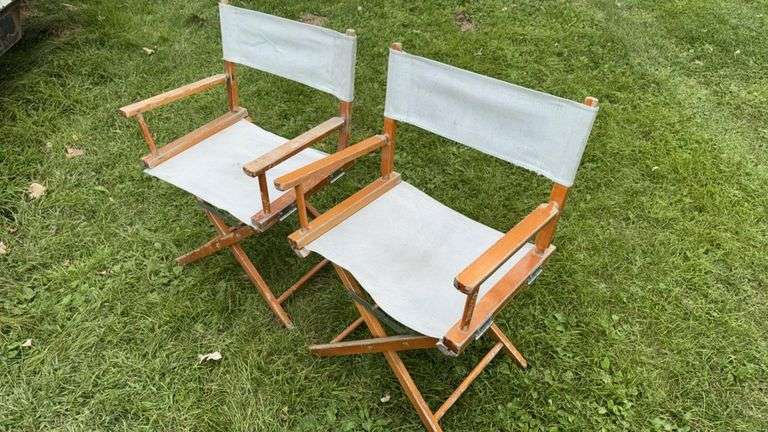 Director's Chairs, wood frame, white canvas, foldable, set of 2, material: wood frame with canvas seat and back, dimensions: typically around 34 in x 20 in x 16 in, weight: typically around 7 lbs, maximum weight capacity: typically around 250 lbs, additional features: armrests, cross-braced legs.