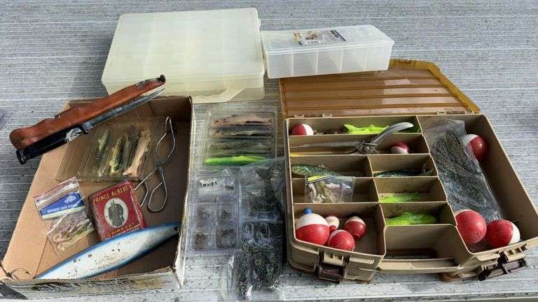 Fishing Tackle Box Set with Lures, Bobbers, Knife & Sheath, various fishing lures, fish hooks, tackle boxes, approximately 12 compartments in the main tackle box, plastic and cardboard construction, beige tackle box, transparent plastic boxes.