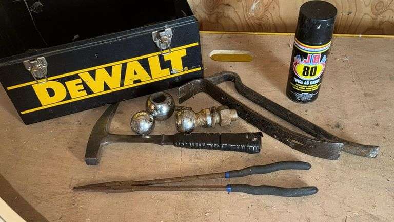 Trailer hitch balls, chrome finish, material: steel, ball diameter: 2 inches (5.08 cm), shank diameter: 1 inch (2.54 cm), weight capacity: 3500-5000 lbs, included accessories: Dewalt toolbox, crowbar, hammer, pliers, JB 80 spray lubricant.