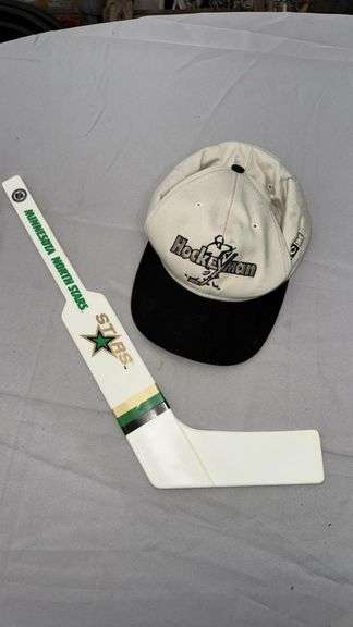 Minnesota North Stars mini hockey stick and cap, Type: Miniature Hockey Stick and Cap, Material: Plastic (stick), Fabric (cap), Color: White, Green, Gold, Black (stick); White and Black (cap), Logo/Branding: Minnesota North Stars, Hockey Man.