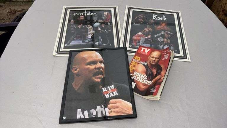 WWE Wrestling Memorabilia featuring The Rock, Undertaker, and Stone Cold Steve Austin, 8.5 x 11 inches (21.6 x 27.9 cm), glossy paper, TV Guide, WWF/WWE, iconic wrestlers from the Attitude Era.