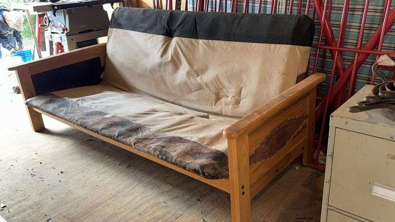 Futon Sofa Bed, Wood Frame, Fabric Cover, Multi-colored, dimensions approximately 80x35x33 inches, decorative side panels, convertible positions include sofa and bed, common weight capacity around 500-600 lbs, typical mattress material polyester or foam, typical mattress thickness 6-8 inches.