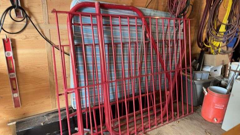 Red Metal Double + Twin Bunk Bed, Metal construction, Color: Red, Mattress Sizes: Double (bottom), Twin (top), Integrated ladder, Assembly required. One mattress included
