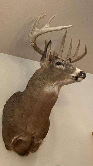 White-tailed Deer Shoulder Mount, 10 points, approx. 16-18" antler spread, shoulder mount style, approx. 30" overall height, approx. 18" overall width, approx. 24" overall depth, weight approx. 20-30 lbs, wall mounting with appropriate hardware, natural fur and antler coloration, glass eyes.